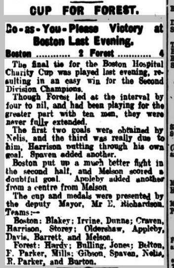This was the final of the Boston Charity Cup. We won 4-2 (and were 4-0 up at half time) but the Nottingham Journal says we played most of the game with just 10 men although they didn't say who went off.